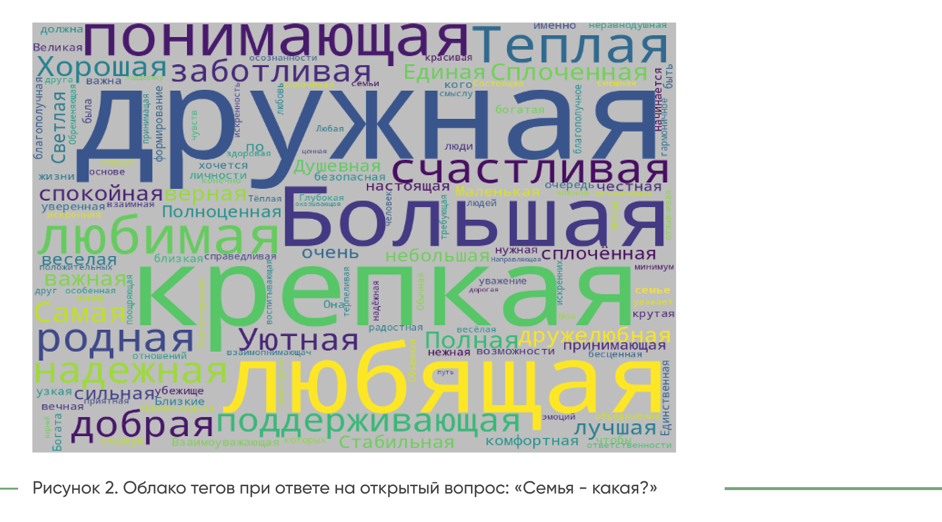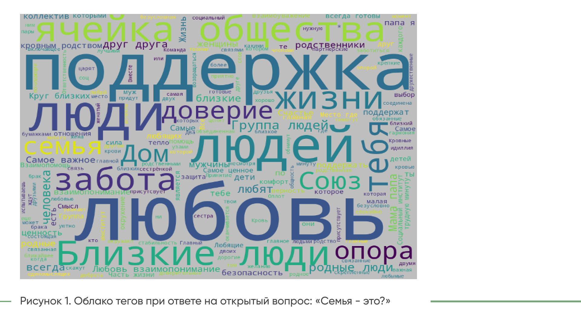 Результаты опроса показали позитивное видение респондентами семьи как микромира, являющегося опорой, сообществом родных людей или союзом влюблённых, основанного на доверии, верности, взаимной любви, призванного оказывать взаимопомощь, поддержку, дарить тепло и заботу (Рисунок 1).