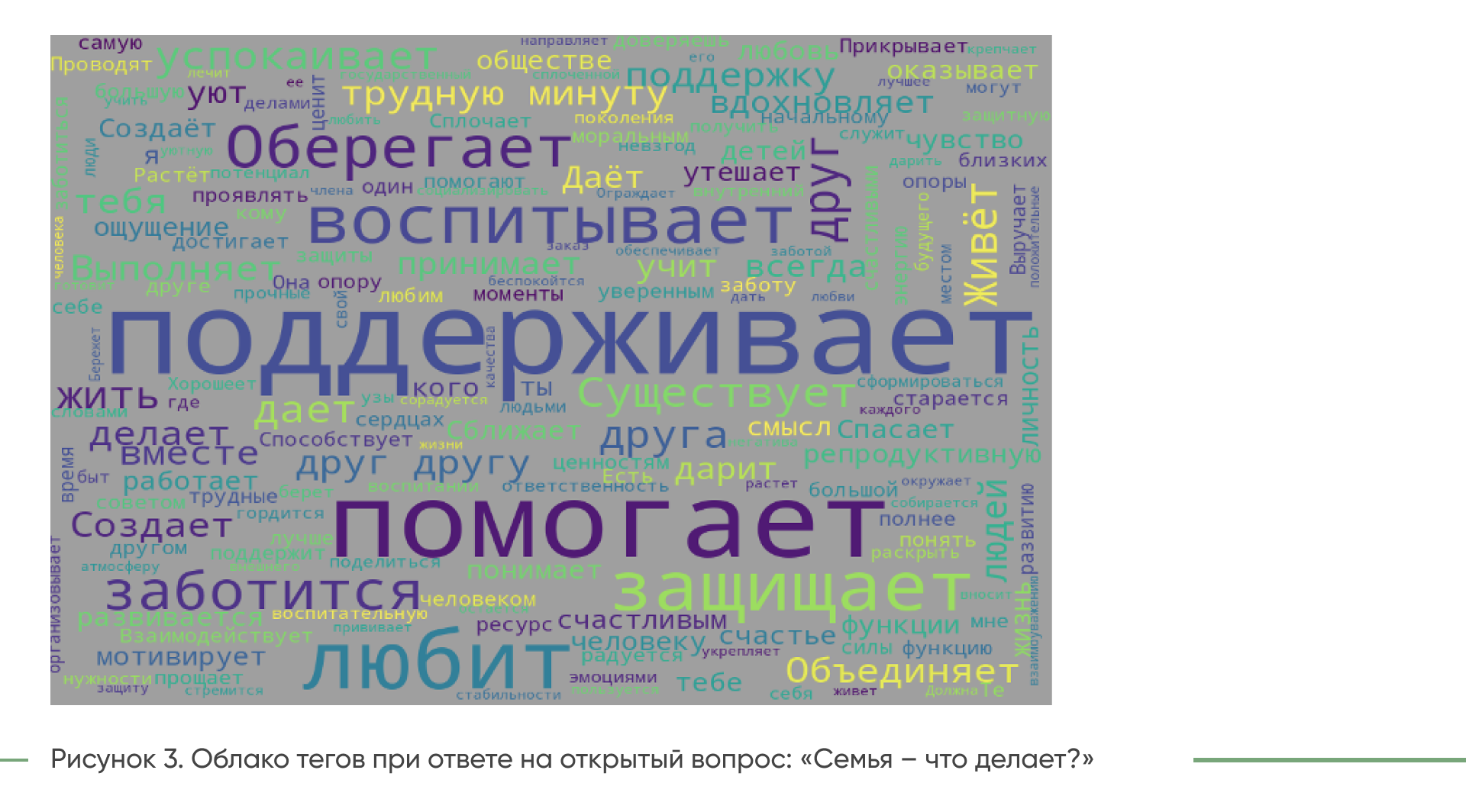 Характеризуя функции семьи, респонденты указывают на её традиционное предназначение: помогать, воспитывать, поддерживать в сложной жизненной ситуации, защищать от опасностей, объединять и вдохновлять на новые свершения (Рисунок 3).