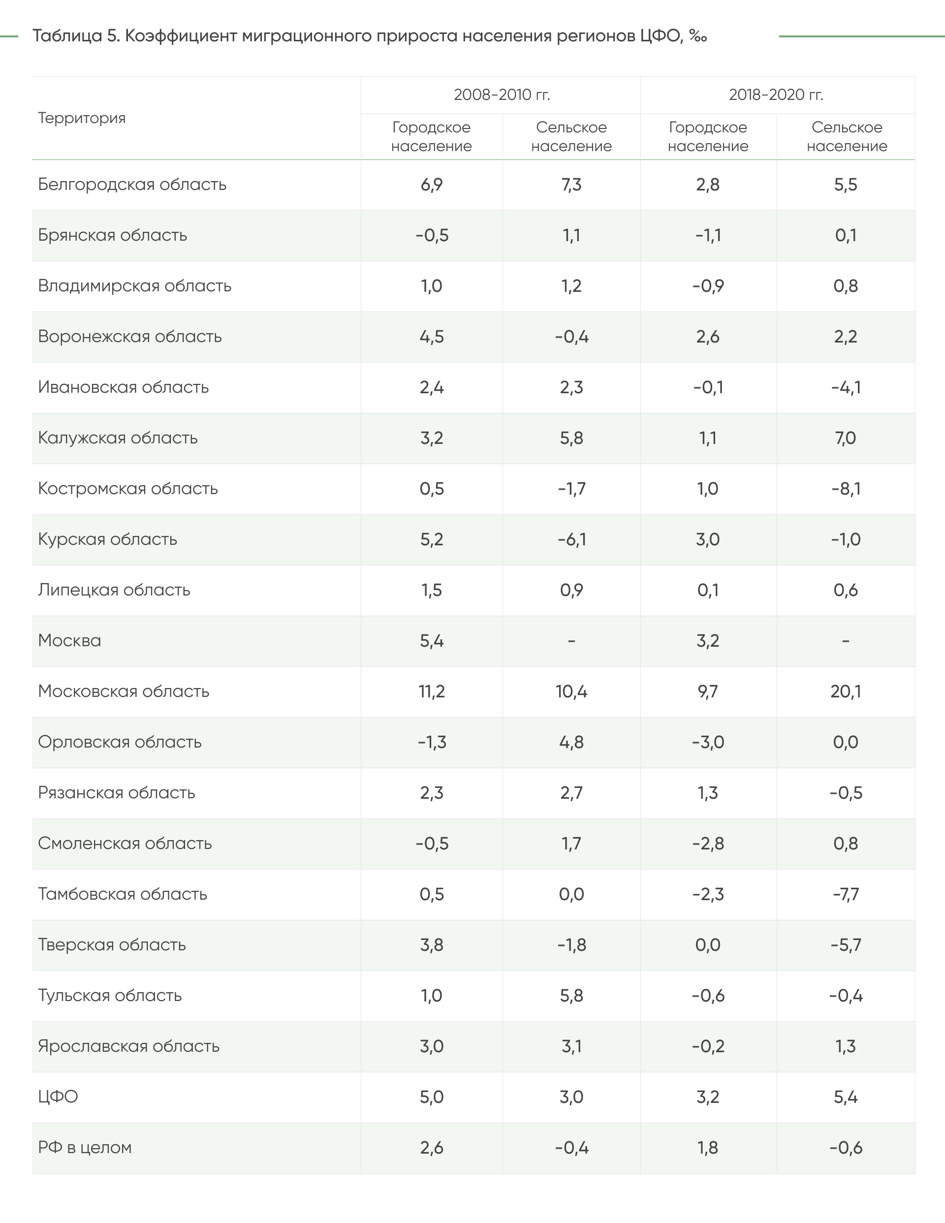 регионах ЦФО в 2020 г. коэффициент естественного прироста сельского населения