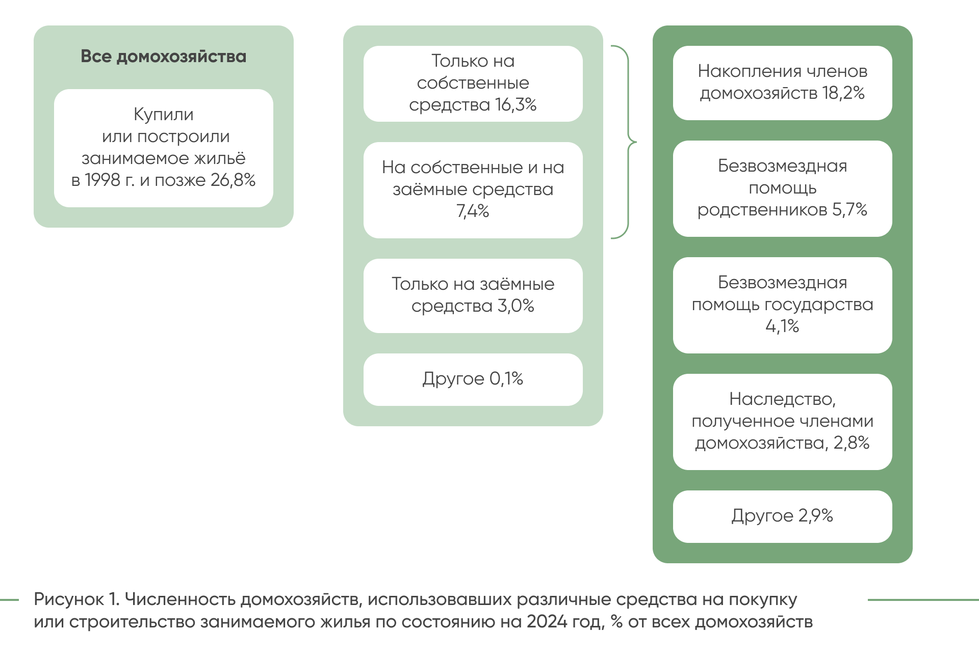 Если члены домохозяйства не получили жильё в дар или по наследству, не пользуются жильём родственников, а купили или построили его самостоятельно, это не исключает участия родственников в ресурсном обеспечении этой покупки. На момент обследования в 2024 г. 26,8% российских домохозяйств занимали жильё, которое они купили или построили в 1998 г. или позже; 23,7% домохозяйств сделали это с использованием собственных средств, под которыми в обследовании подразумевается широкий круг ресурсов, за исключением банковских займов (см. Рисунок 1).