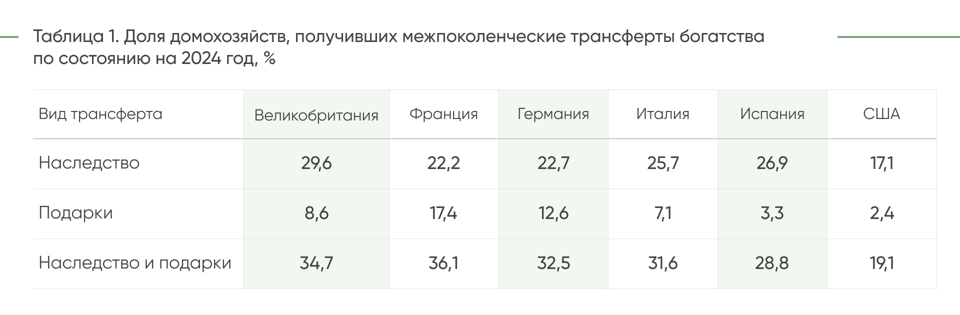В целом зарубежные исследования показывают, что получение наследства или прижизненных подарков в виде экономических активов — не массовый факт, и в любой совокупности опрошенных, репрезентирующей население любой из стран, о том, что на момент опроса он был в их жизни, сообщают 20-35% респондентов. Причём чётко прослеживается эффект Матфея (при упрощённой трактовке евангельской притчи — деньги к деньгам): по сравнению с менее состоятельными среди состоятельных индивидов доля тех, кто получал экономические трансферты, выше, а величина этих трансфертов в денежном выражении — больше.