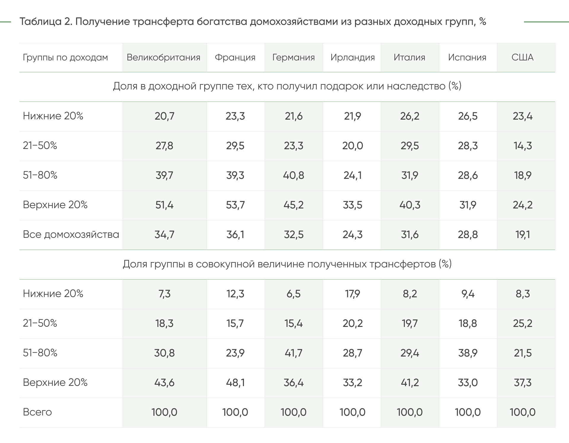 Получение межпоколенных экономических трансфертов как факт отмечено у домохозяйств всех доходных групп (см. табл. 2, верхняя часть: Доля в доходной группе тех, кто получил подарок или наследство…), но чем выше домохозяйства находятся на доходной лестнице, тем больше среди них тех, кто получал активы в дар или в наследство. Эта закономерность выражена во всех семи странах, хотя в США и Испании слабее, чем в остальных. Причём из семи стран Испания ближе всех к другой модели: факт получения экономического трансферта не зависит от того, к какой доходной группе относится домохозяйство — реципиент трансферта. Если же измерять трансферты не по факту получения, а по доле переданного богатства, доставшегося той или иной доходной группе, то разночтений по странам нет: на долю 50% высокодоходных домохозяйств приходится 60-75% от всего объёма переданного богатства. Во Франции, Британии и Италии 20% наиболее высокодоходных домохозяйств получают более 40% трансферта богатства своих стран (см. табл. 2, нижняя часть: Доля группы в совокупной величине полученных трансфертов…).
