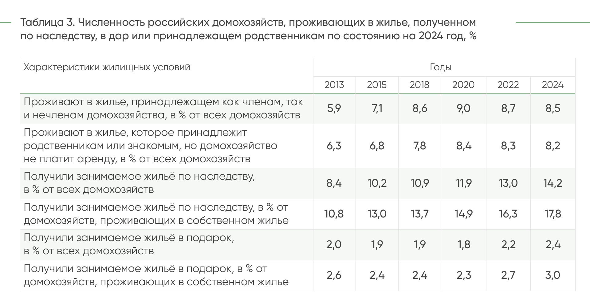 Однако наиболее распространённый вариант проявления родственных отношений в отношениях собственности — получение жилья в наследство. В 2013—2024 гг., то есть за десятилетие, доля домохозяйств, поселившихся в полученном в наследство жилье, выросла в полтора раза — с 8,4 до 14,2% (см. Таблицу 3). Параллельно за это же время доля тех, кто жил в приватизированном жилье, сократилась с 48,3 до 37,1%, а живущих в купленном или построенном жильё, наоборот, выросла с 32,7 до 41,3%. Эти цифры отражают, во-первых, поколенческую смену жильцов и разный статус жилья для разных поколений расширенной семьи: для старшего оно было, к примеру, приватизированным, а младшие получили его в наследство. Во-вторых, расширенные семьи не «выпускают» жильё наследодателей из своего совокупного имущественного портфеля, хотя сдерживающим фактором может быть низкий спрос на такое жильё, ограниченность локального рынка жилья. Так, наименьшая доля живущих в полученном по наследству жилье — среди московских домохозяйств: 12,8% в 2024 г. (из домохозяйств, проживающих в собственном жилье); в городах-миллионниках — 21,7%; в других крупных городах — 16,9%; в городских населённых пунктах с численностью населения до 100 тыс. чел. — 17,2%; в сельских населённых пунктах — 18,5%. Однако (в-третьих) жилищные межпоколенные трансферты не входят в число распространённых социальных практик доступа к собственному жилью.