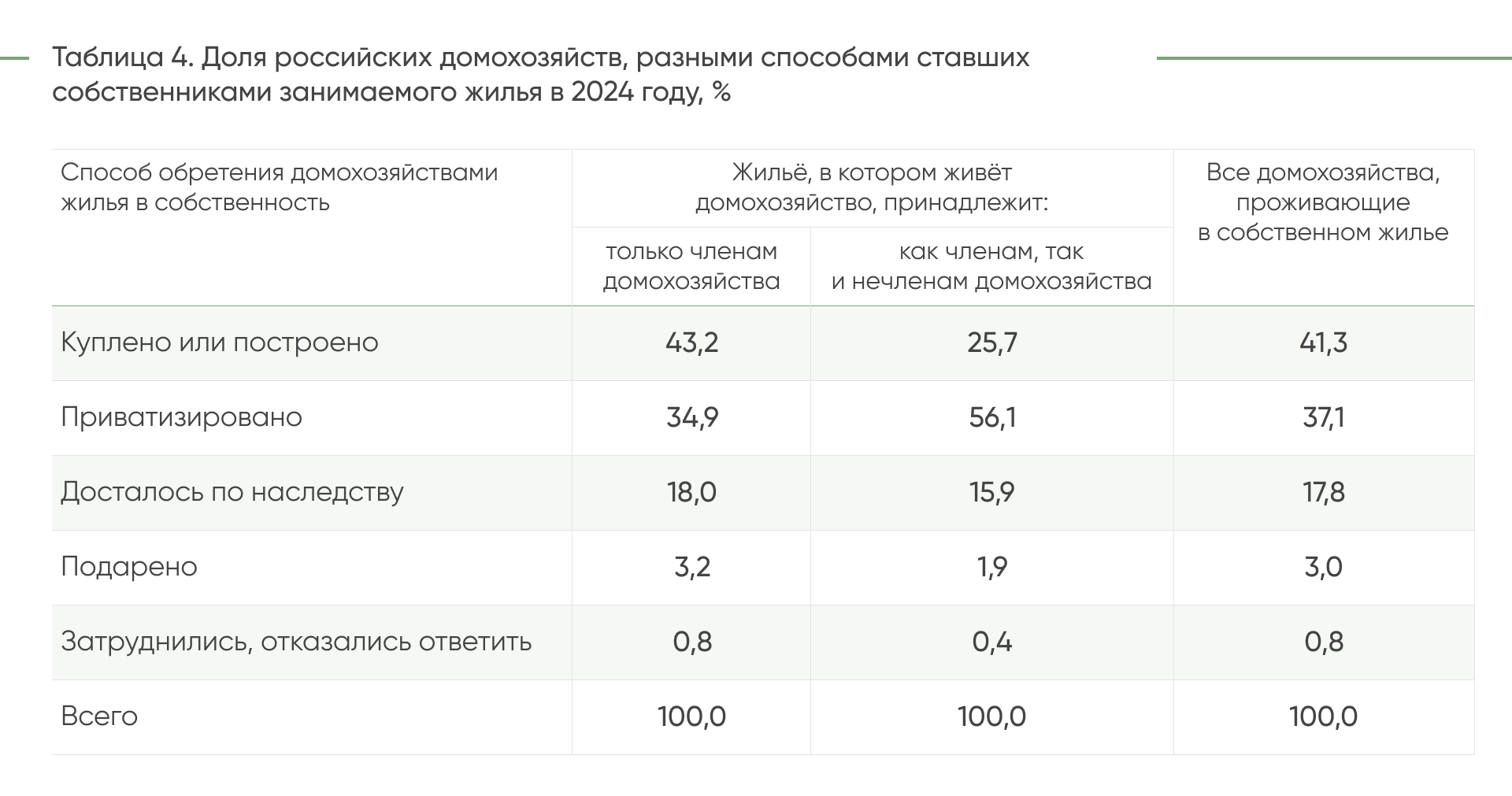 Во-вторых, на данных ВОДПФ мы видим, что среди домохозяйств, занимающих жильё, которое принадлежит как членам домохозяйства, так и другим лицам, высока доля тех, кто приватизировал своё жильё (56% против 37% среди всех домохозяйств в 2024 г.). Материалы интервью предлагают в качестве одного из объяснений распространённости практики совладения жильём тех, кто в нём живёт, и тех, кто в нём не живёт, то обстоятельство, что во время бесплатной приватизации жилья родители включали детей в состав собственников, закрепляя за ними долю. Повзрослев и став жить отдельно, эти дети-«долевики» остались номинальными совладельцами жилья, в котором продолжают жить родители.