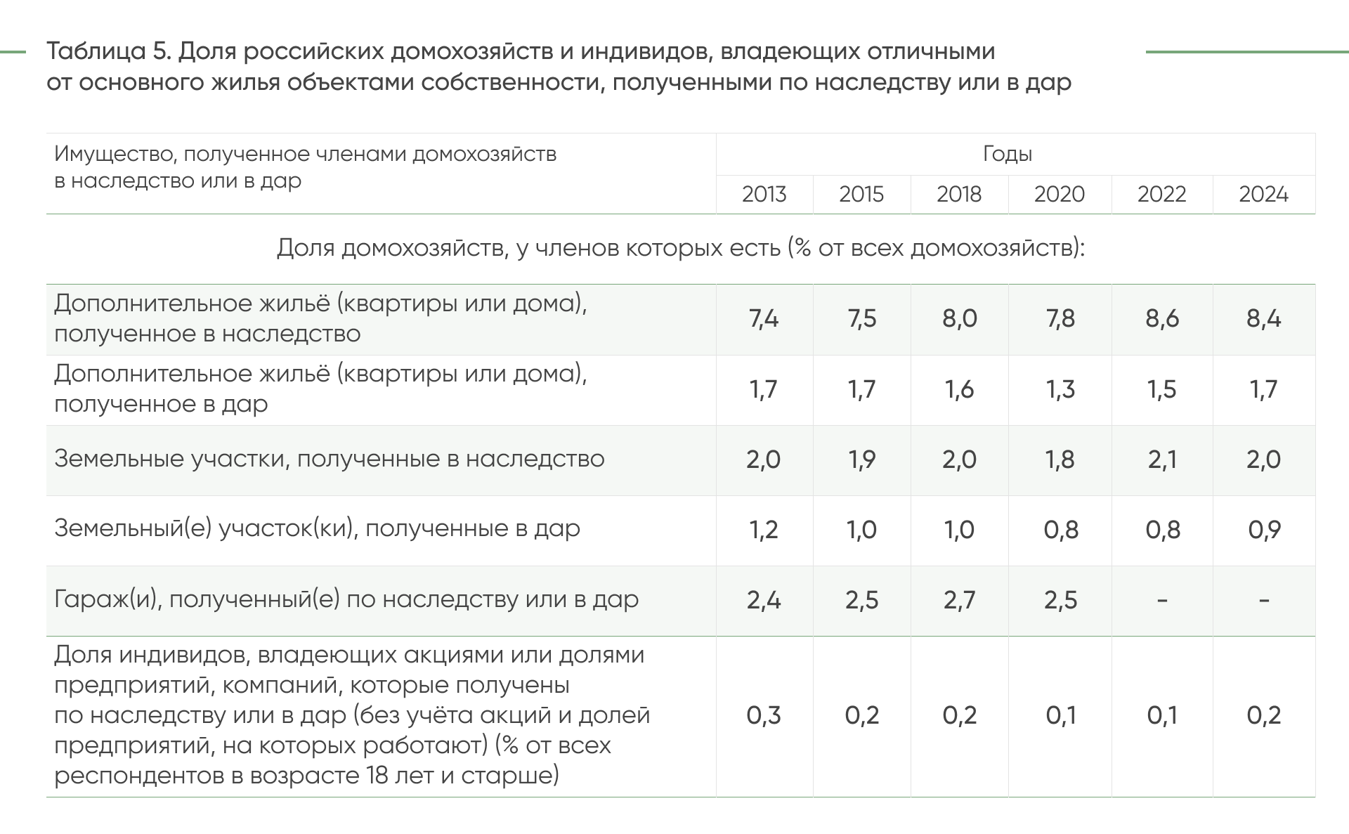 Анализ данных ВОДПФ выявил, что за последнее десятилетие при позитивной динамике вовлечённости российских домохозяйств в межпоколенные трансферты экономических ресурсов эти последние, как и в других странах, не являются широко распространённым источником формирования портфеля собственности домохозяйств: в каждый год на момент обследования не более четверти домохозяйств (26,7% в 2024 г.) обладали хотя бы одним объектом жилой недвижимости или земельным участком, полученным по наследству или в дар. Передача нефинансовых активов по наследству — более частый вид трансферта, чем дар, а основной передаваемый актив — жильё. Помимо прямой передачи собственности, среди практик содействия формированию имущества домохозяйств у расширенной семьи — предоставление жилых помещений родственникам для проживания без взимания арендной платы для осуществления аккумуляции сэкономленных средств и приобретения нефинансовых активов (примерно 8% домохозяйств занимают без арендной платы жильё, принадлежащее не им, а родственникам или знакомым), задействование финансовых средств родственников, полученных в дар или по наследству для приобретения (или строительства) жилья и других активов.