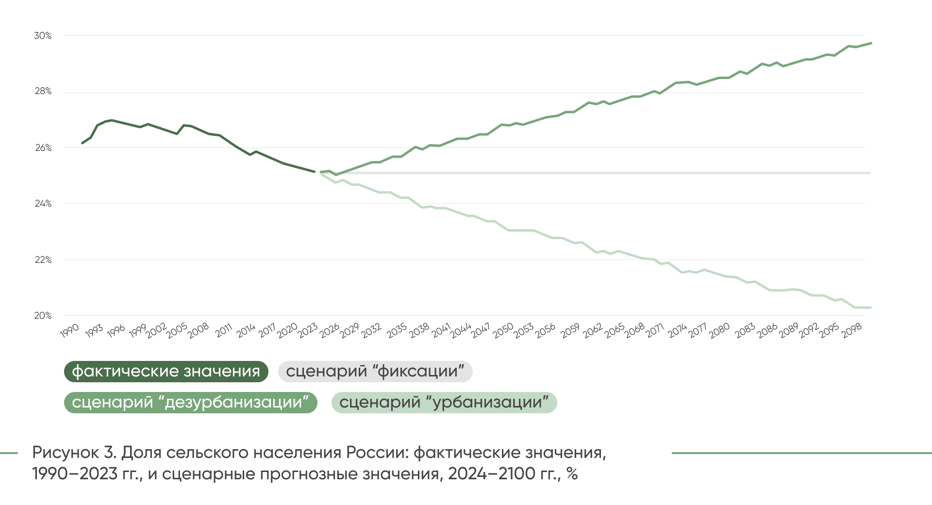 - сценарий «дезурбанизации» — доля сельского населения увеличивается (а доля городского сокращается) теми же темпами, с какими шёл процесс урбанизации в последние десятилетия.